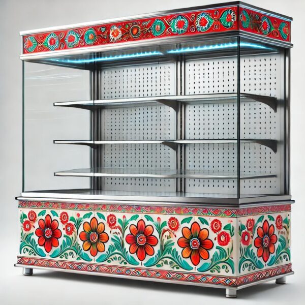 The base of the unit is adorned with intricate, colorful floral patterns, using a mix of red, green, and yellow motifs that draw the customer’s eye. This culturally inspired design adds a festive touch to your shop’s ambiance.